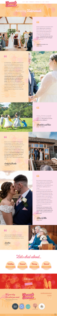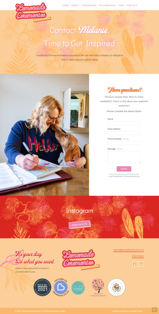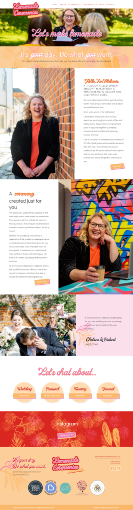 We swirled together her love for heartfelt stories, her knack for making ceremonies a true reflection of her clients, and her zest for life to create a brand as vibrant and fun as Melanie herself. The result? A website that screams ‘Melanie’ in every pixel and invites you to partake in a celebration that’s as fizzy, fun, and unforgettable as a glass of your favourite lemonade.